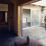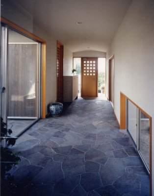 ◇ 玄関ホール ◇ テラス・廊下・書斎等を同じ鉄平石貼りにして、 石や無垢の木材を多用することによって、