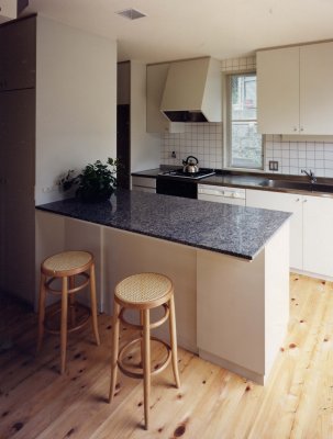 ◇ キッチン ◇ 白を基調としたシンプルなキッチン。 軽い食事が出来るように収納を兼ねたカウンターを設置しました。