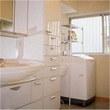 ◇ ダイニング ◇ ダイニングには大容量の収納棚を設置。 ダイニングの奥に見えるのが洗面室。