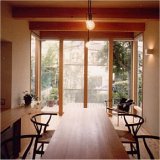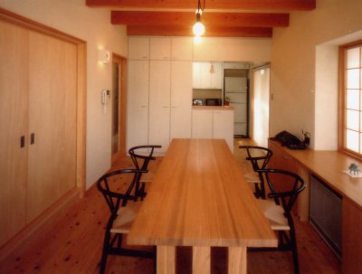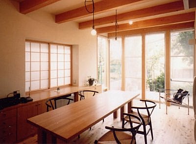 ◇ リビング ◇ 大きな食卓に家族も客も集い、 素足で暮らしたいというご希望に、 アルミサッシの枠を隠す柱と梁が素朴で、 居間の床と同じレベルで続く外部の木製デッキが、 |